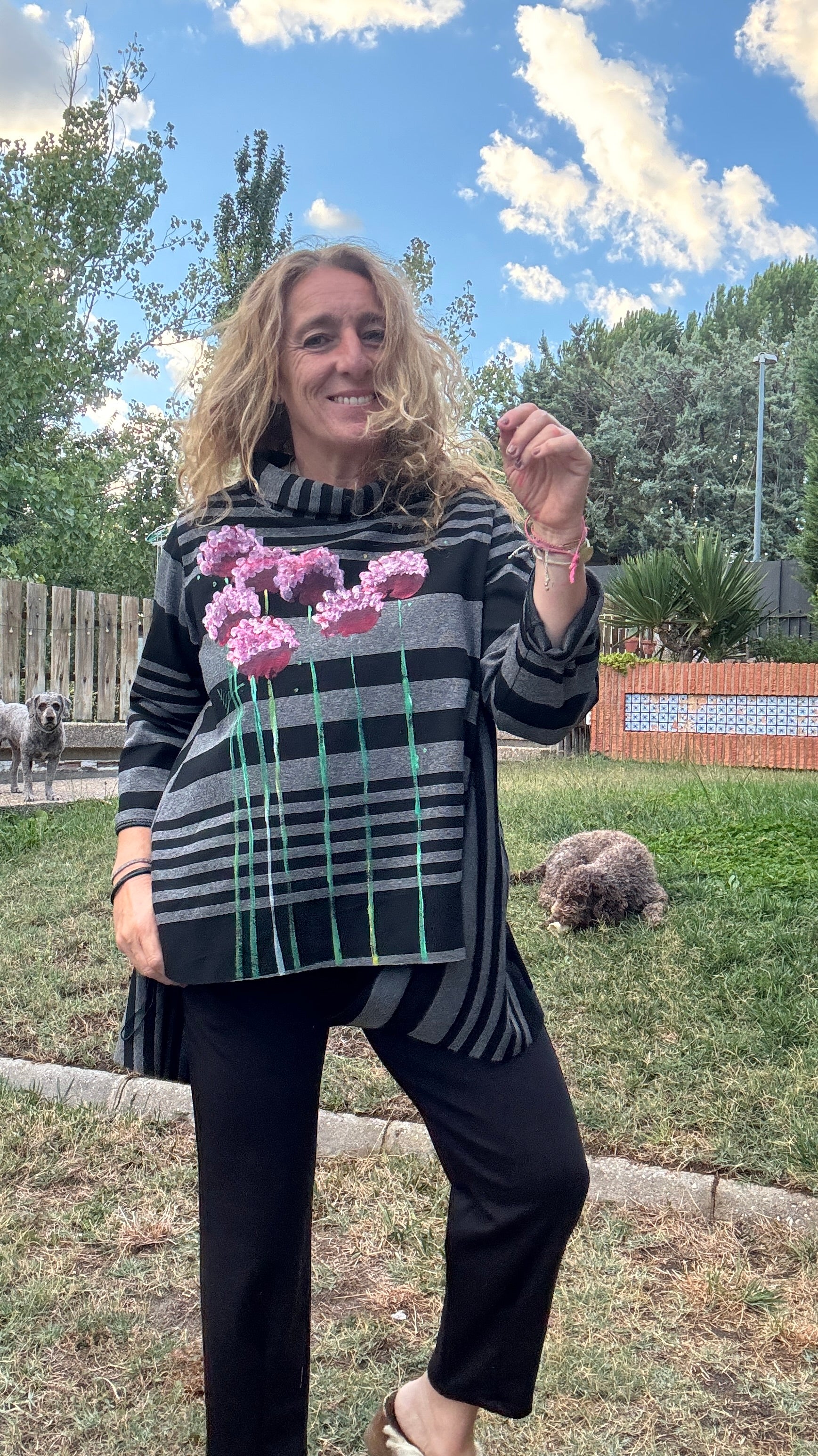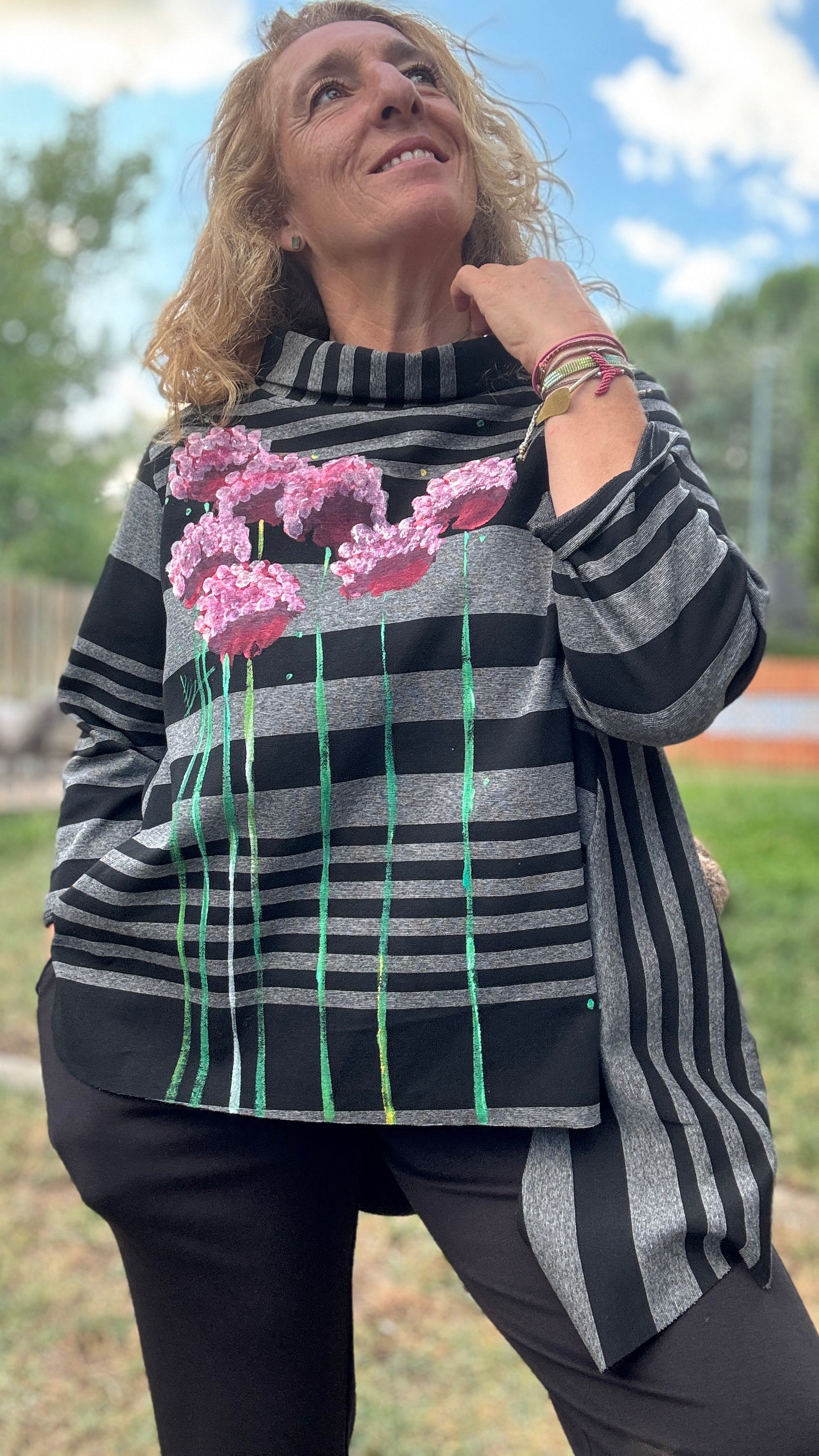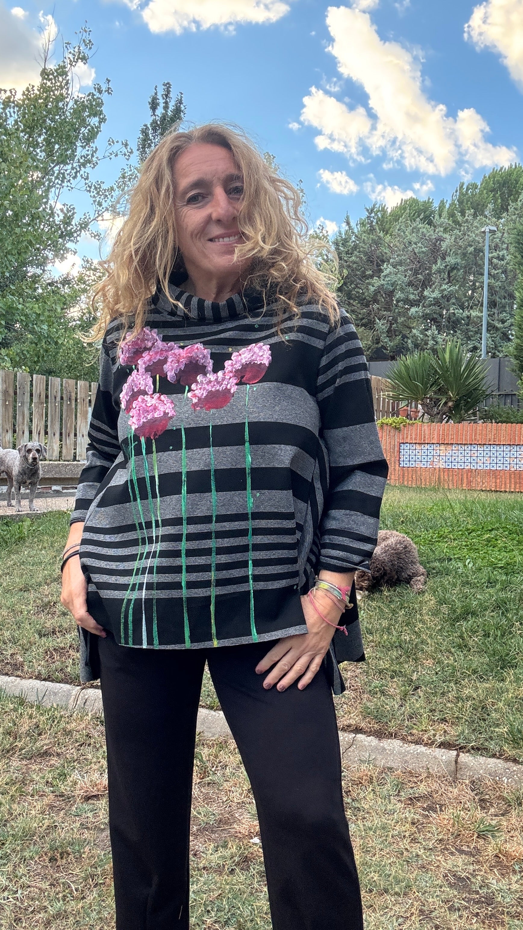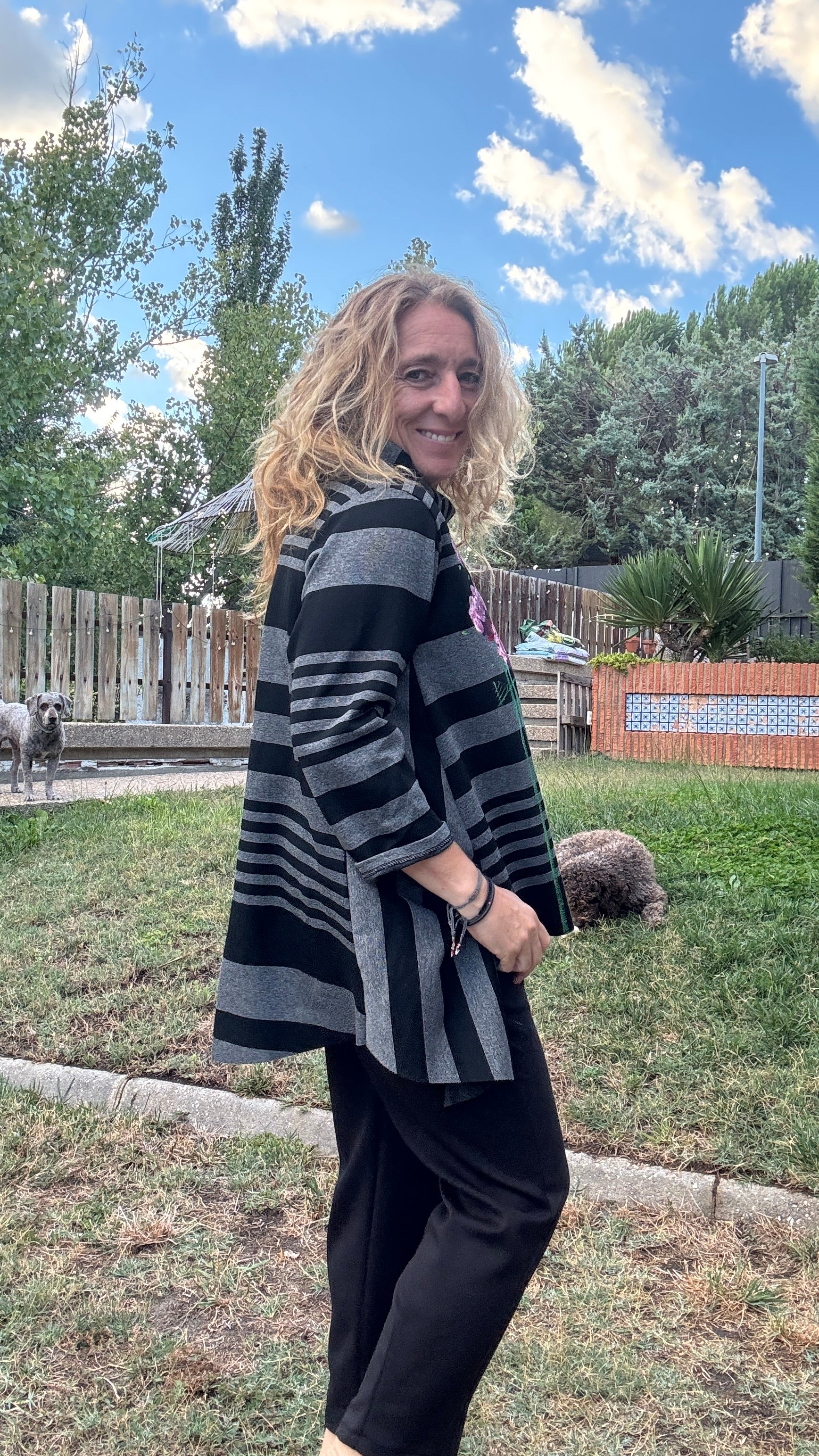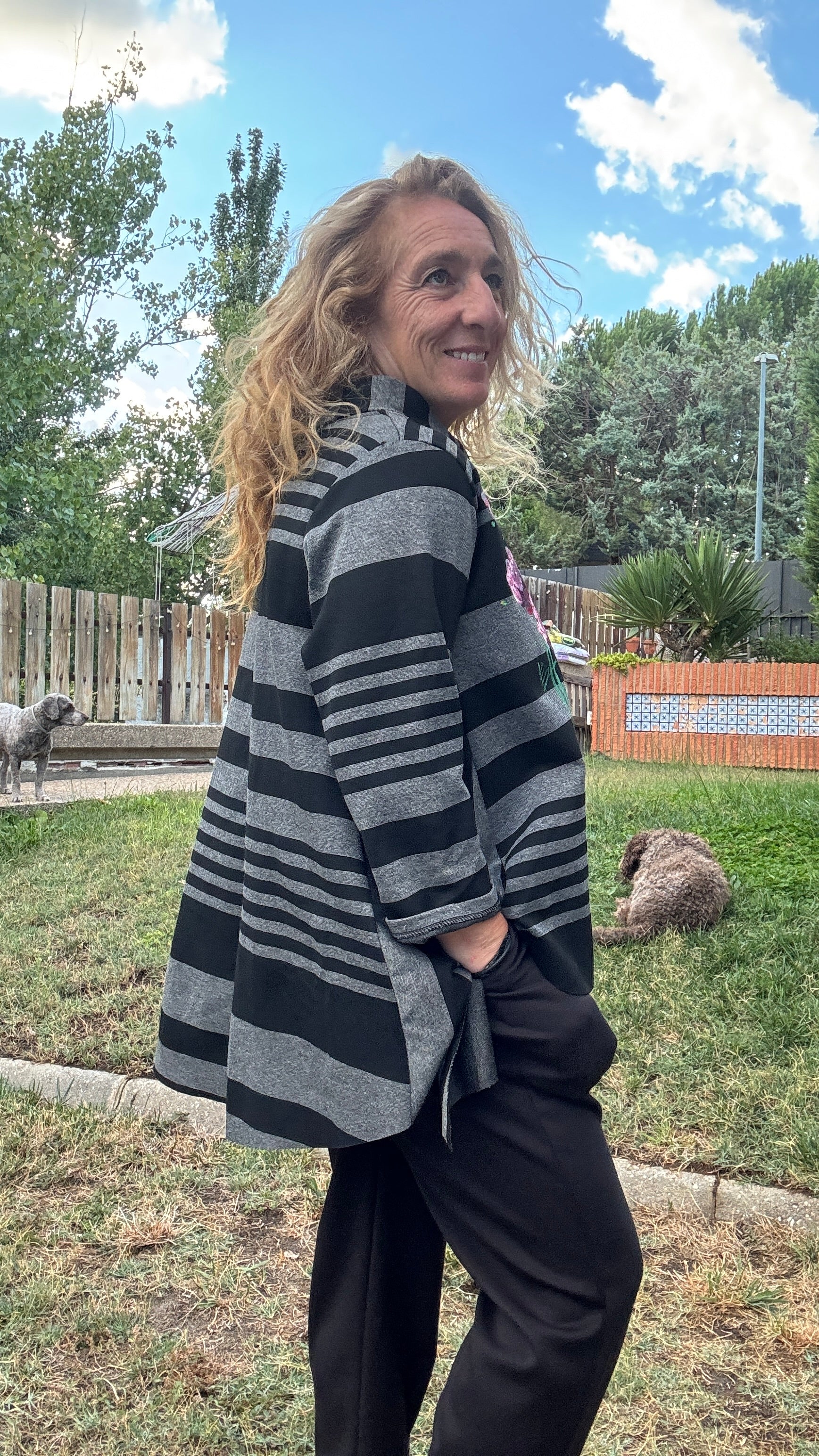 Blusa raya gris y negro, Asimétrica, cuello, barco, medida de sisa, 134 cm