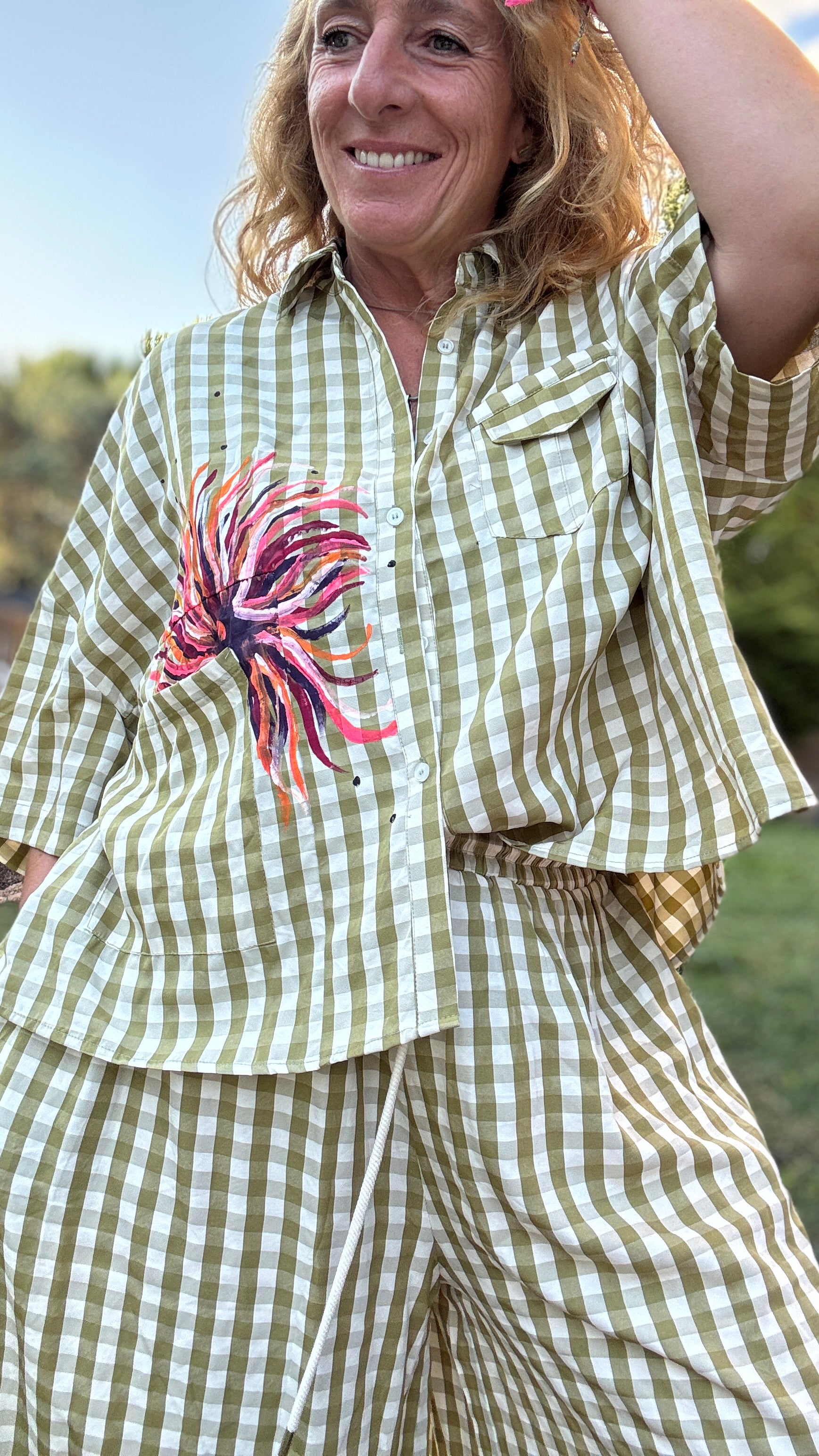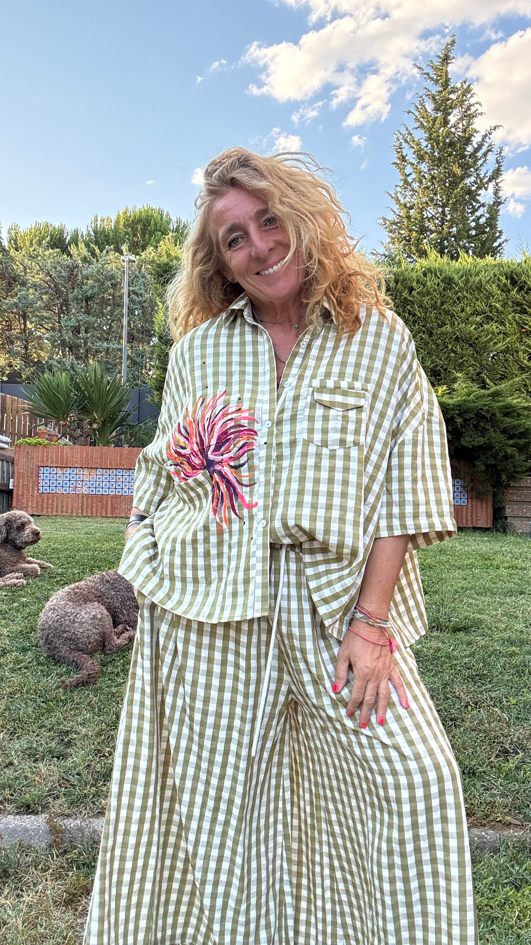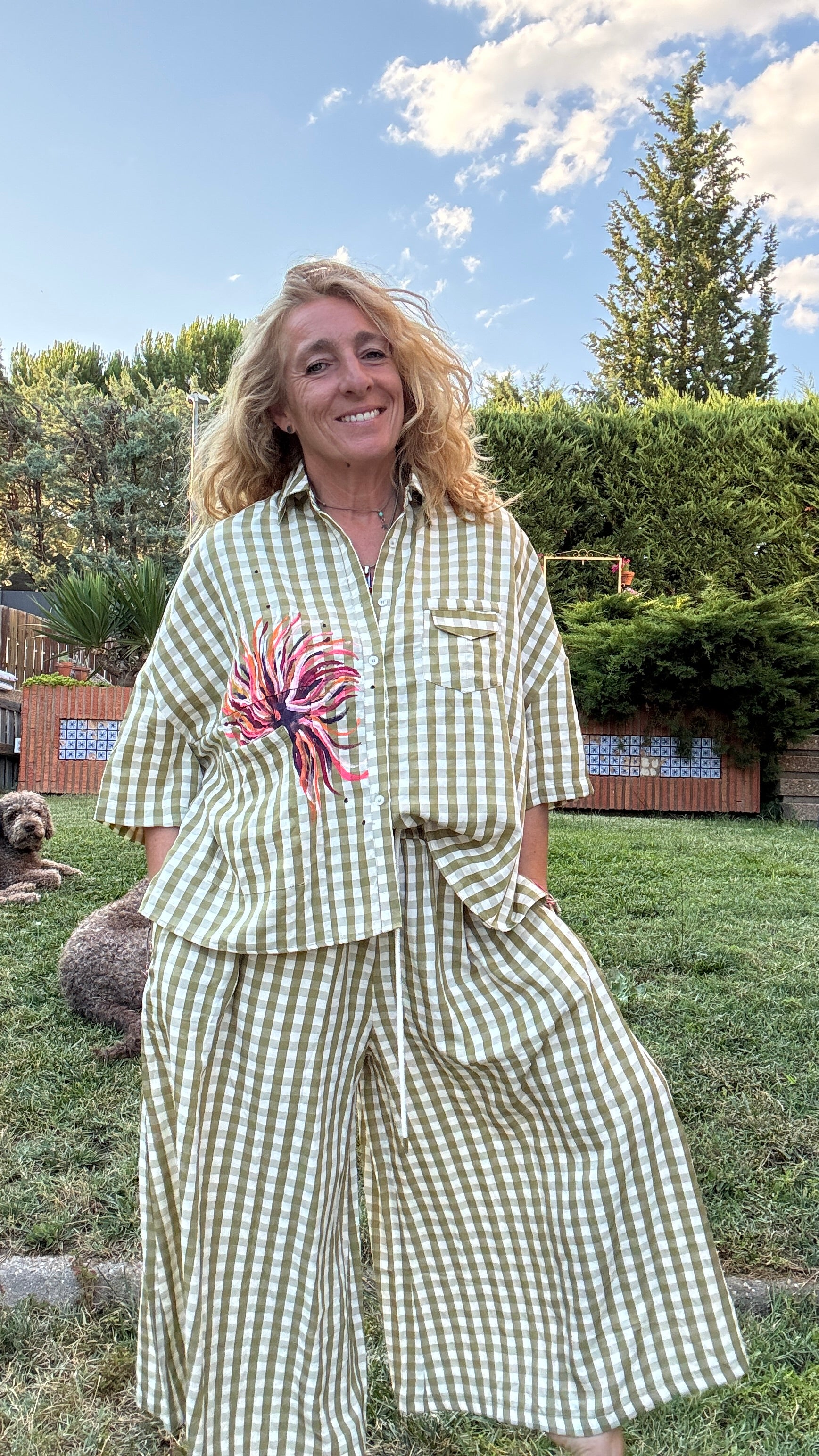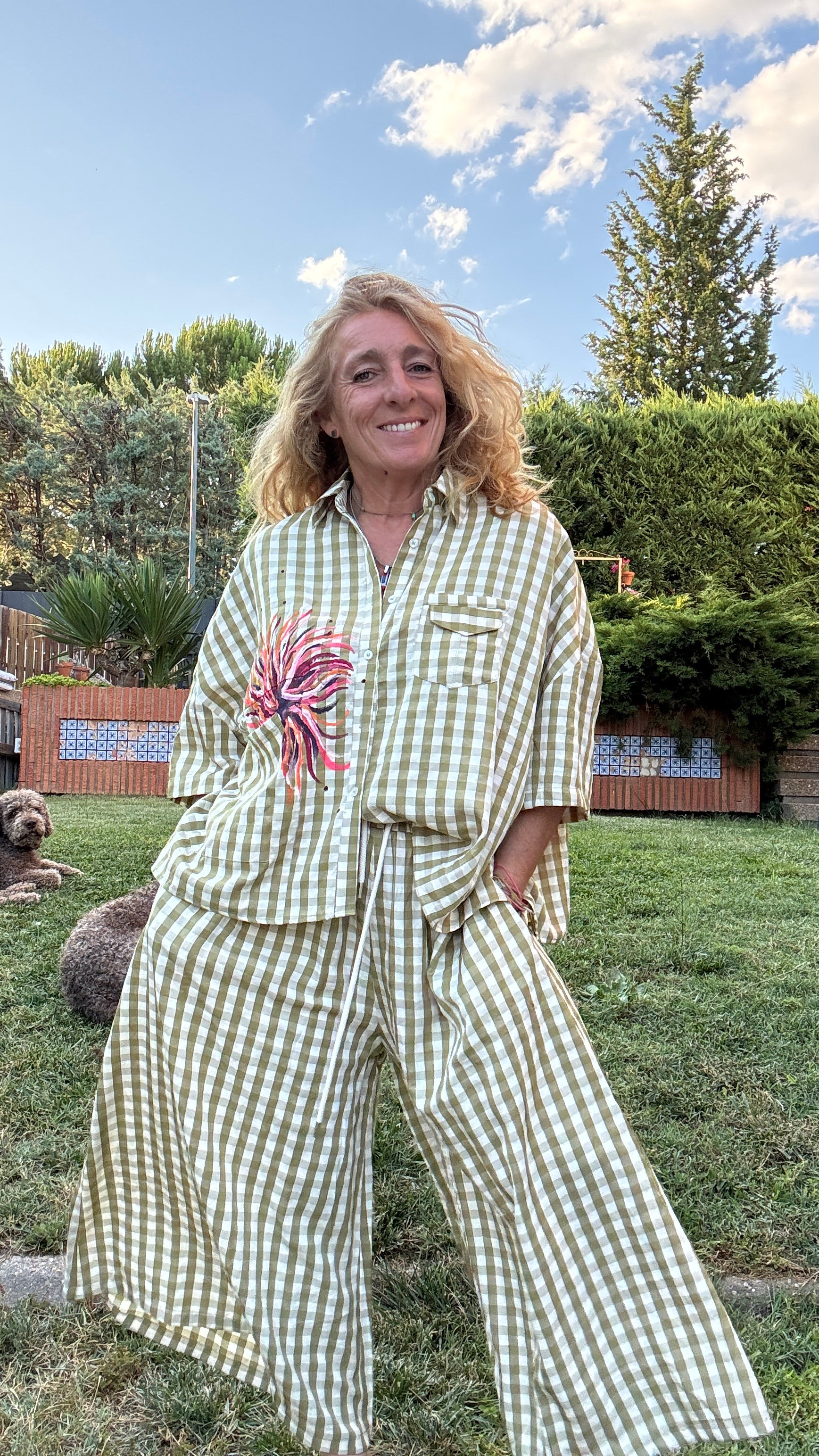 Conjunto Vichy verde, pantalón, con goma de cintura, bolsillos, da mucha talla