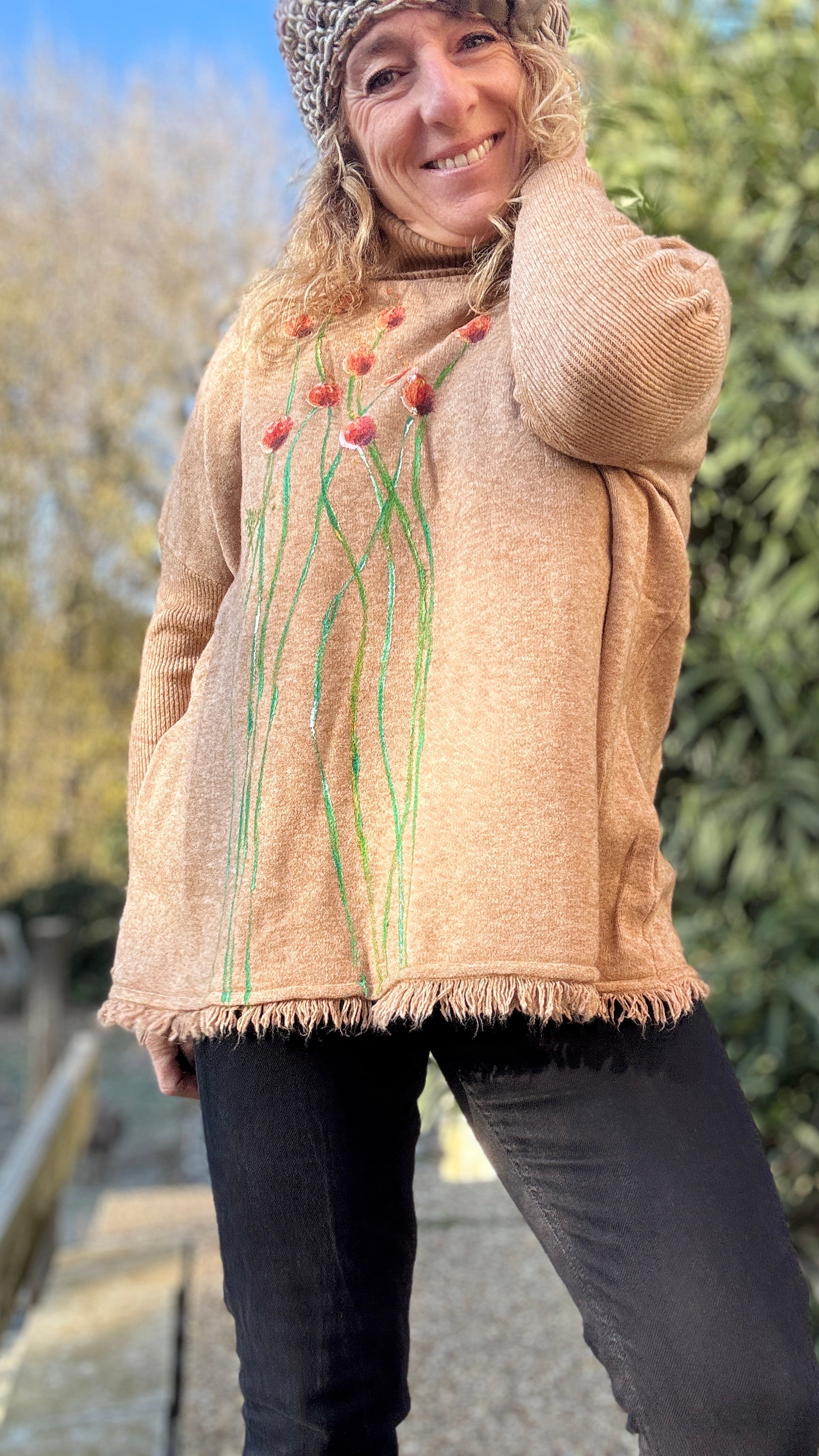 Jersey desflecado, cuello vuelto color camel, talla única
