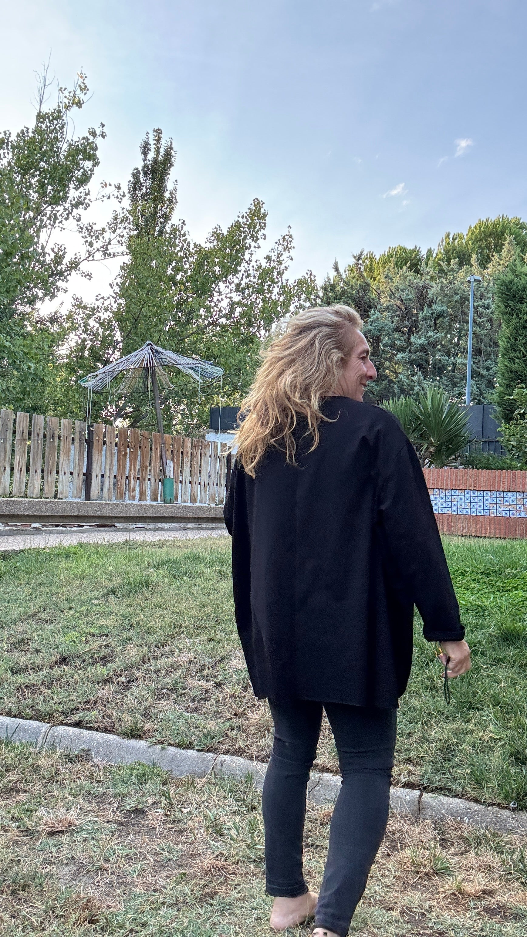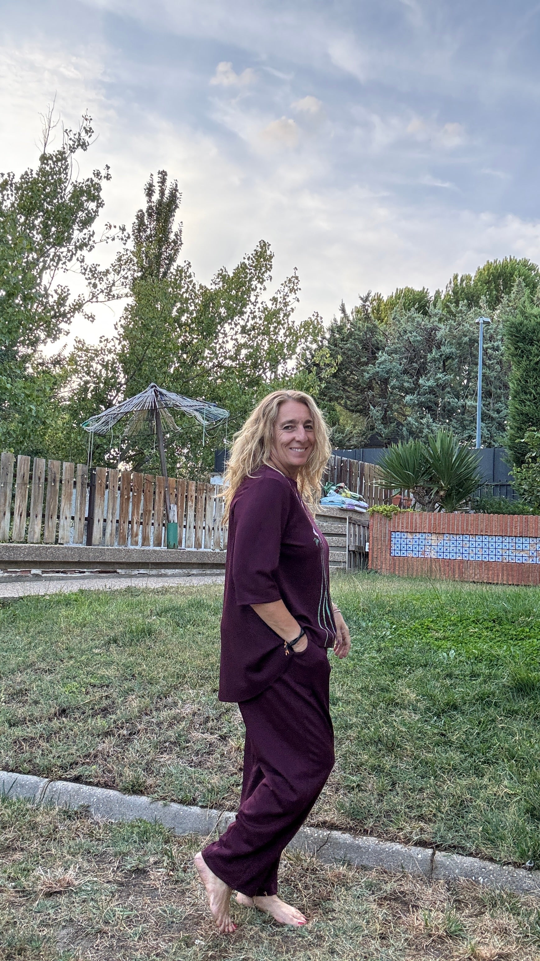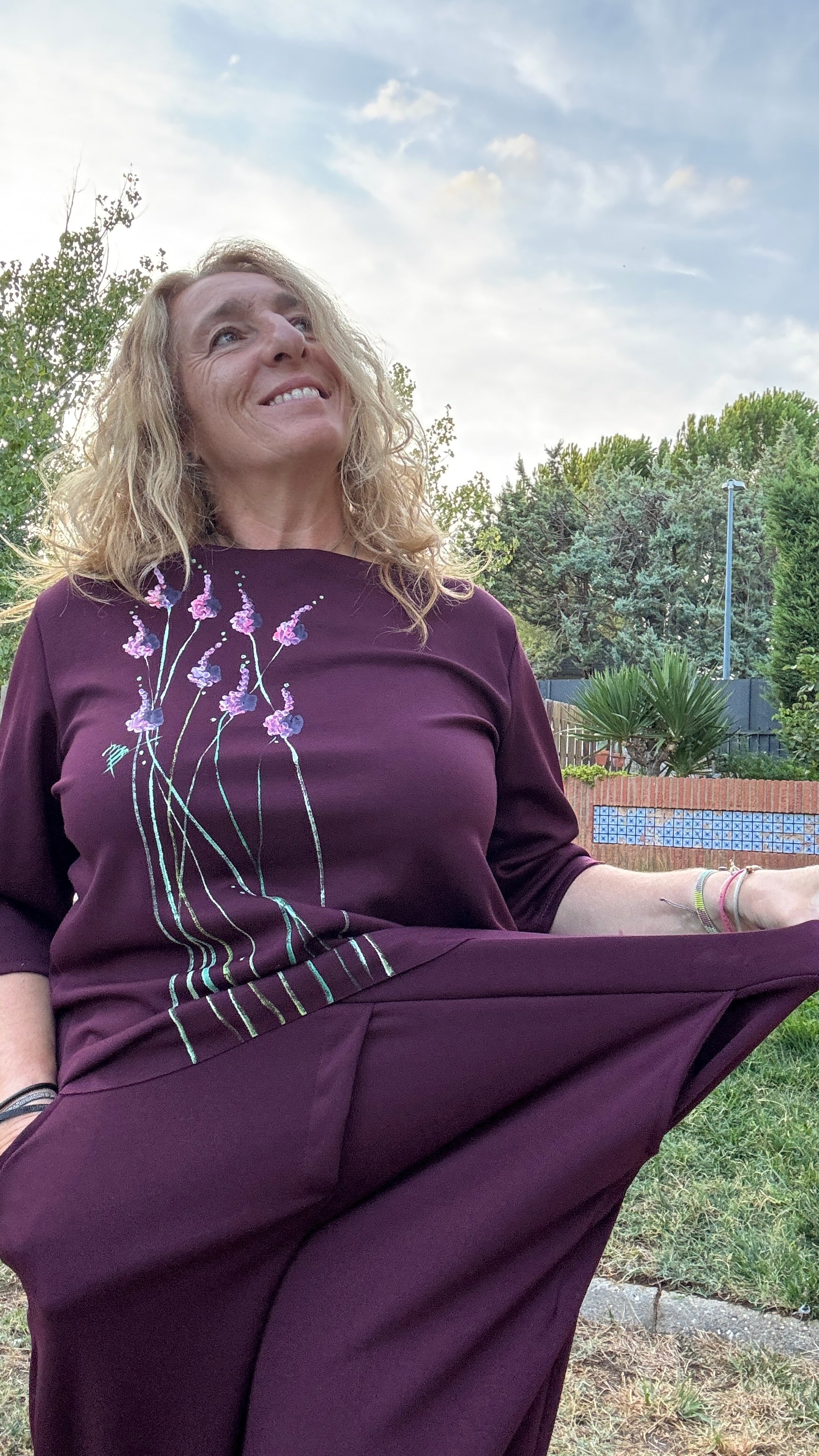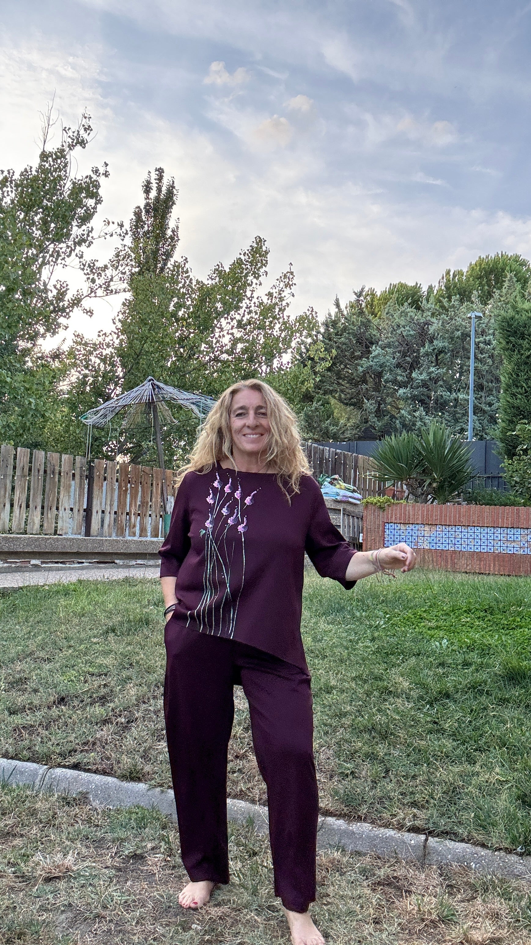 Pantalón punto berenjena, bolsillos , da mucha talla