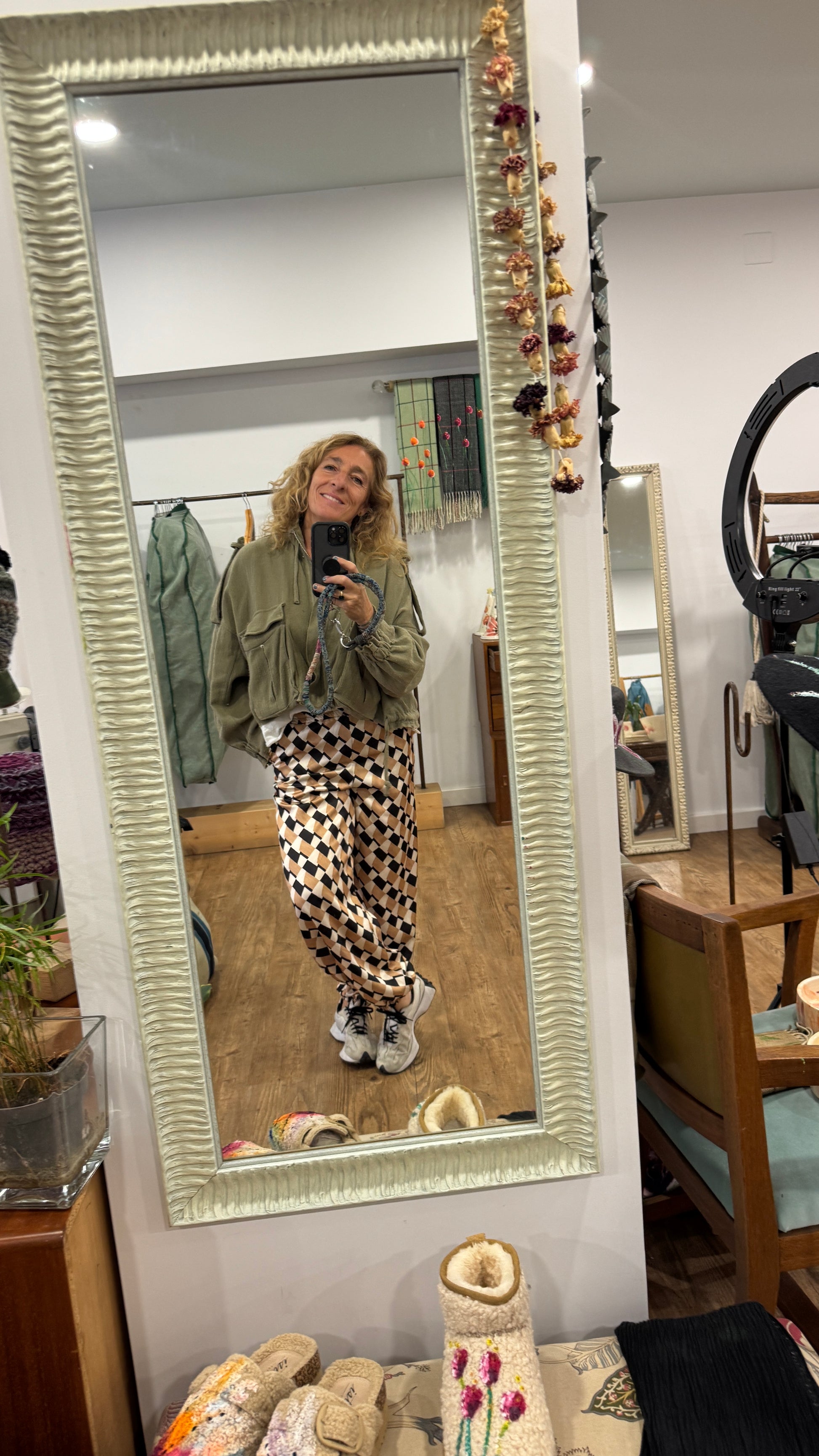 Pantalón rombo Beige, talla única goma en cintura, goma en tobillo, bolsillos