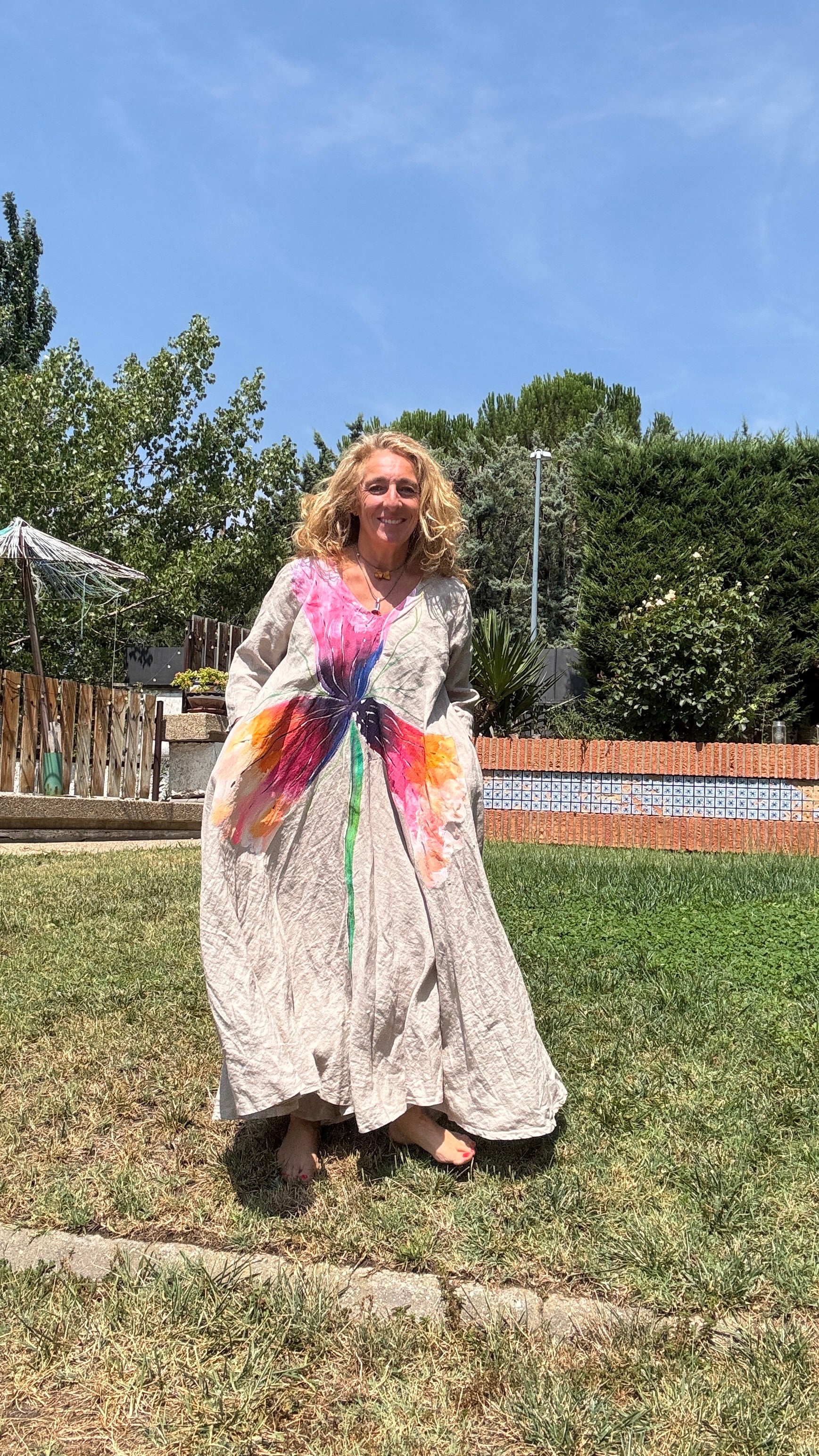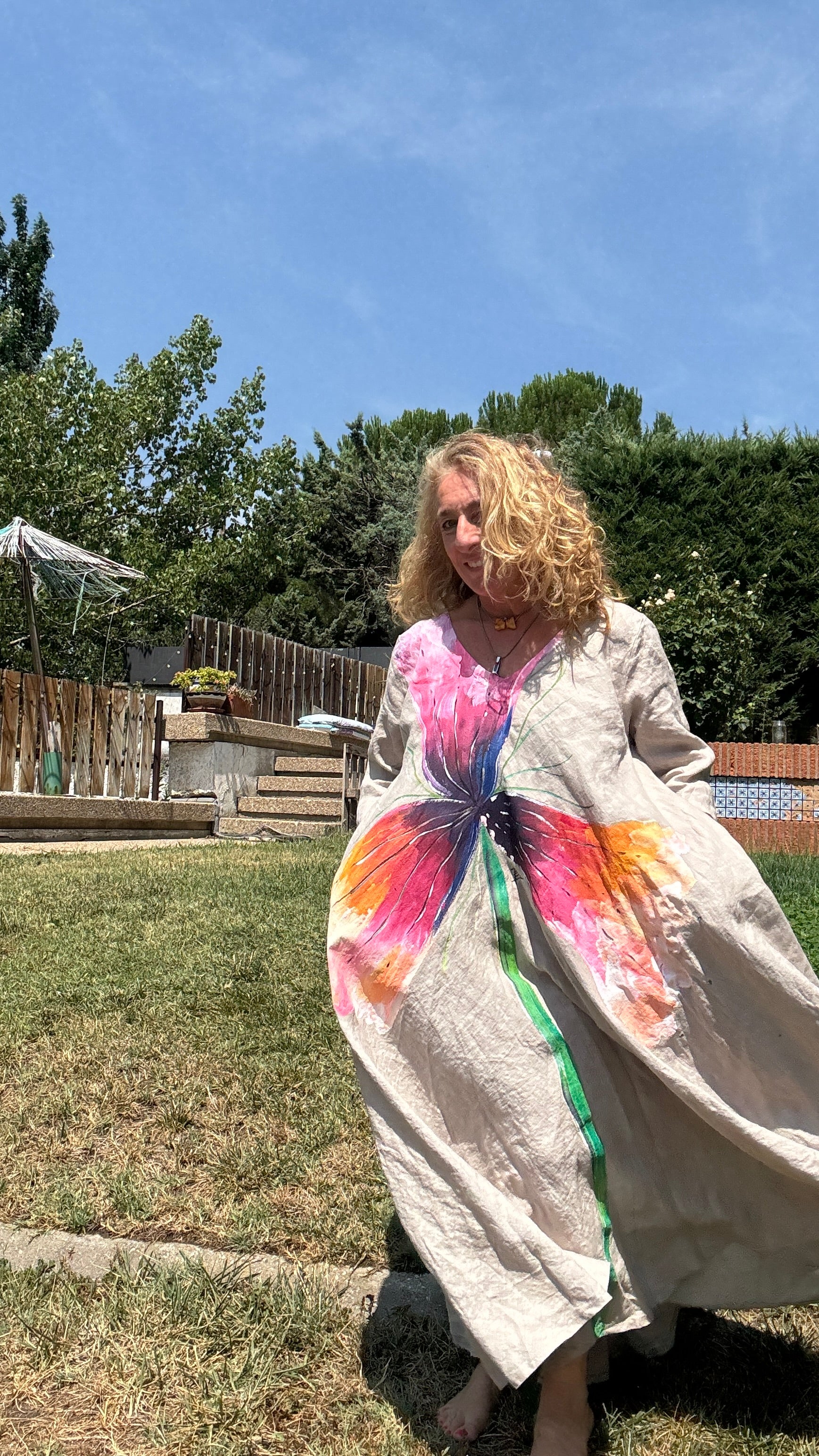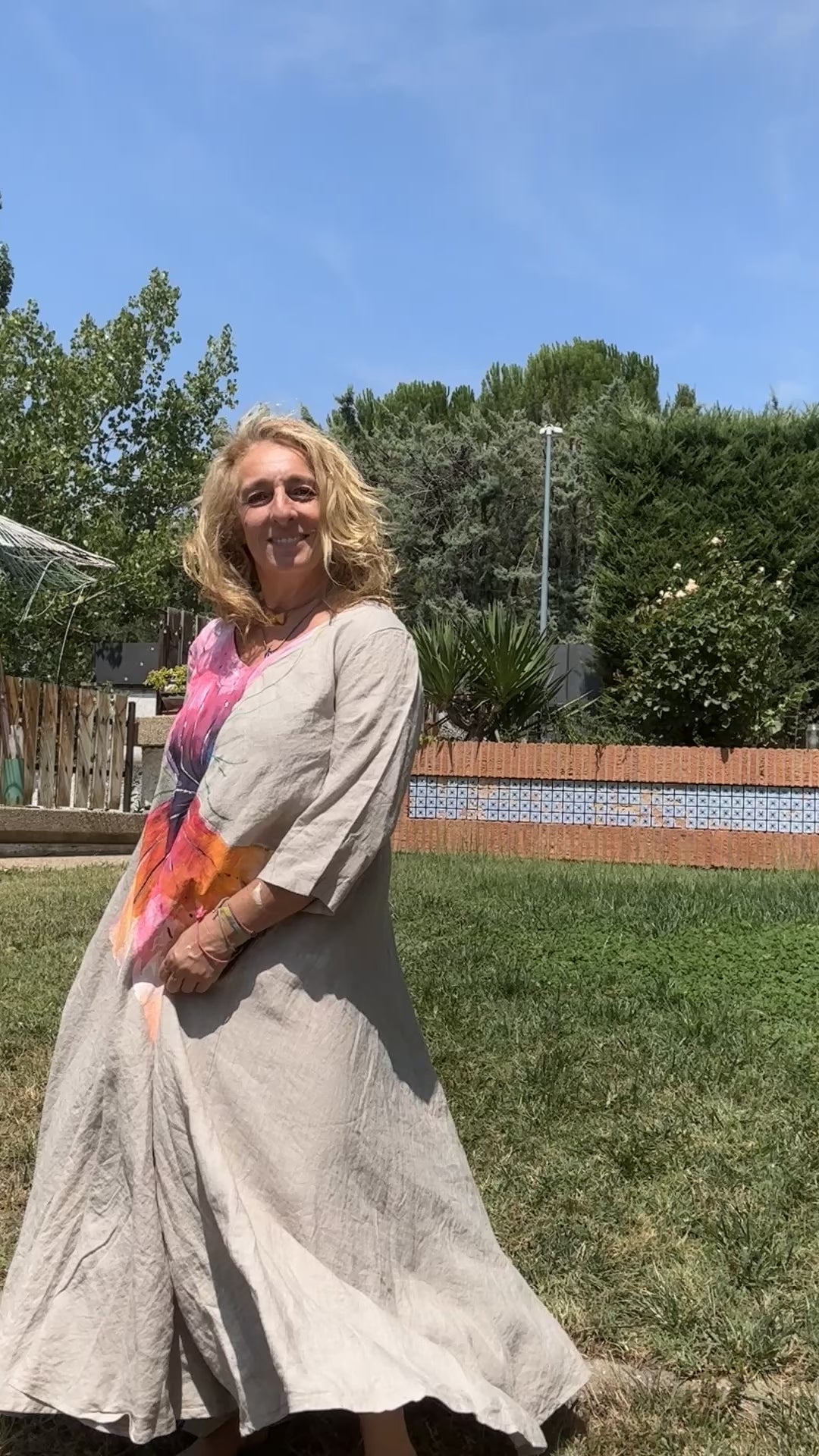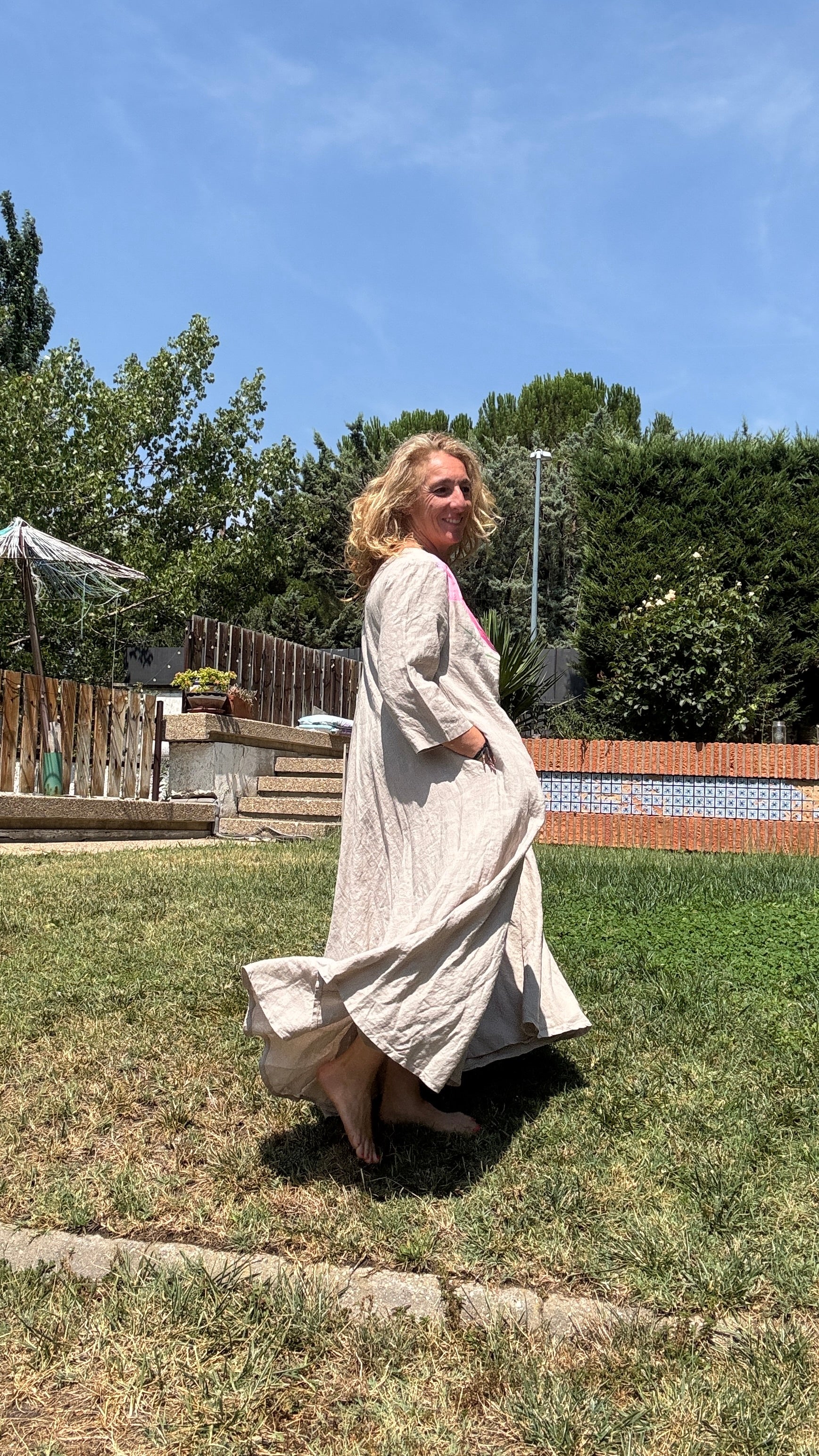 Vestido lino, color topo, bolsillos, talla única, medida de sisa a sisa 68 cm