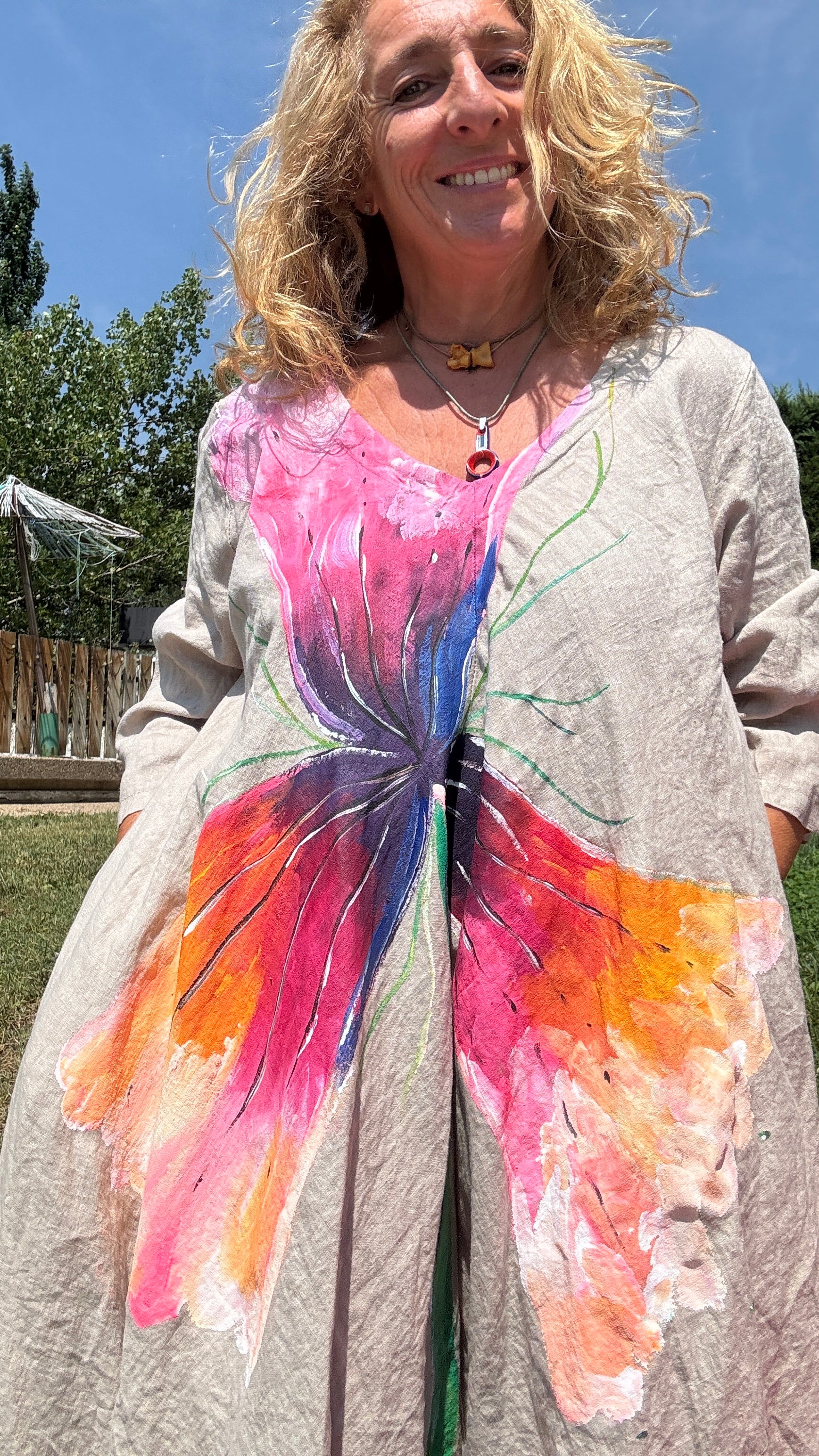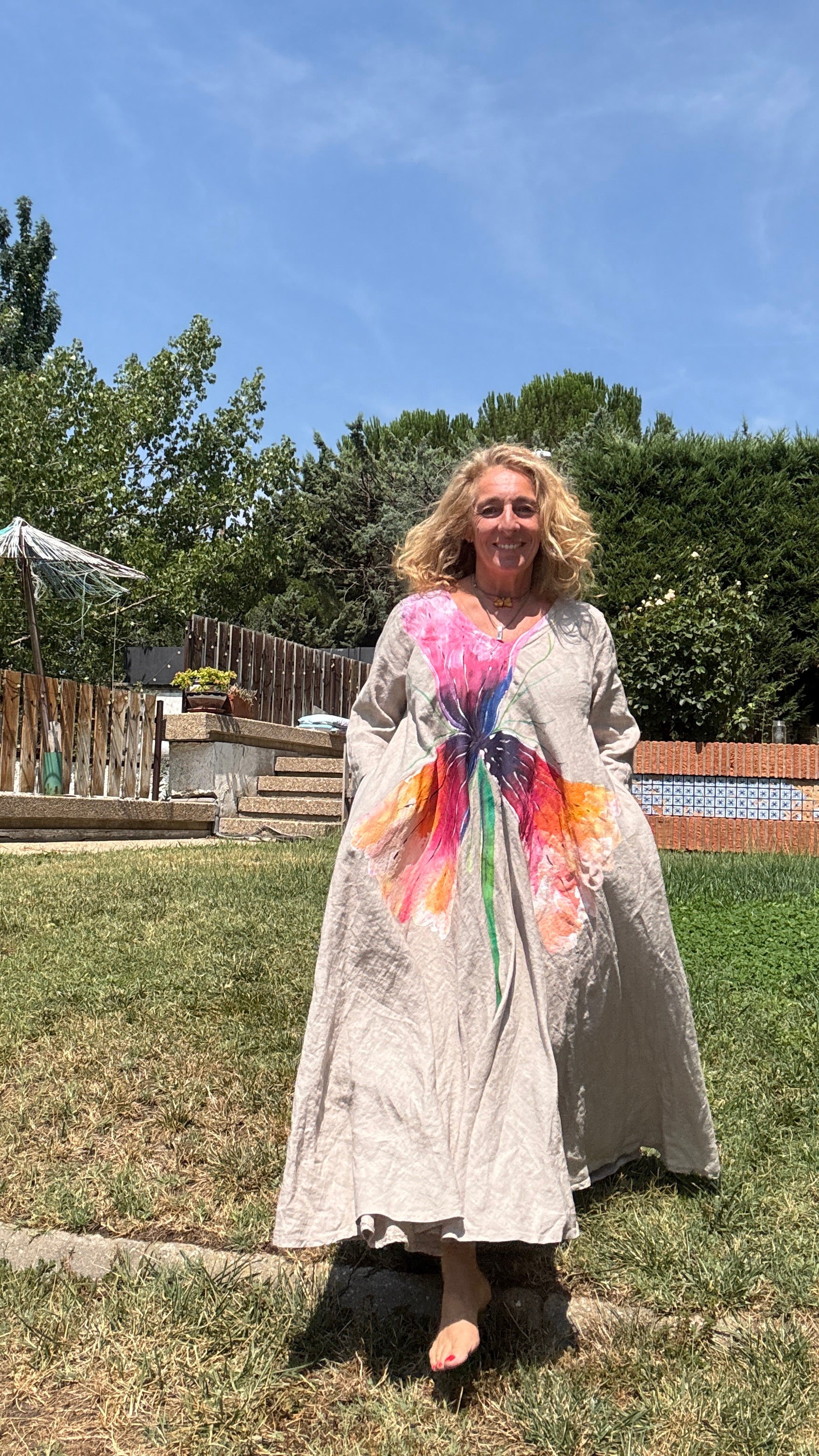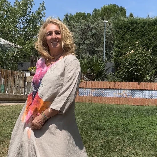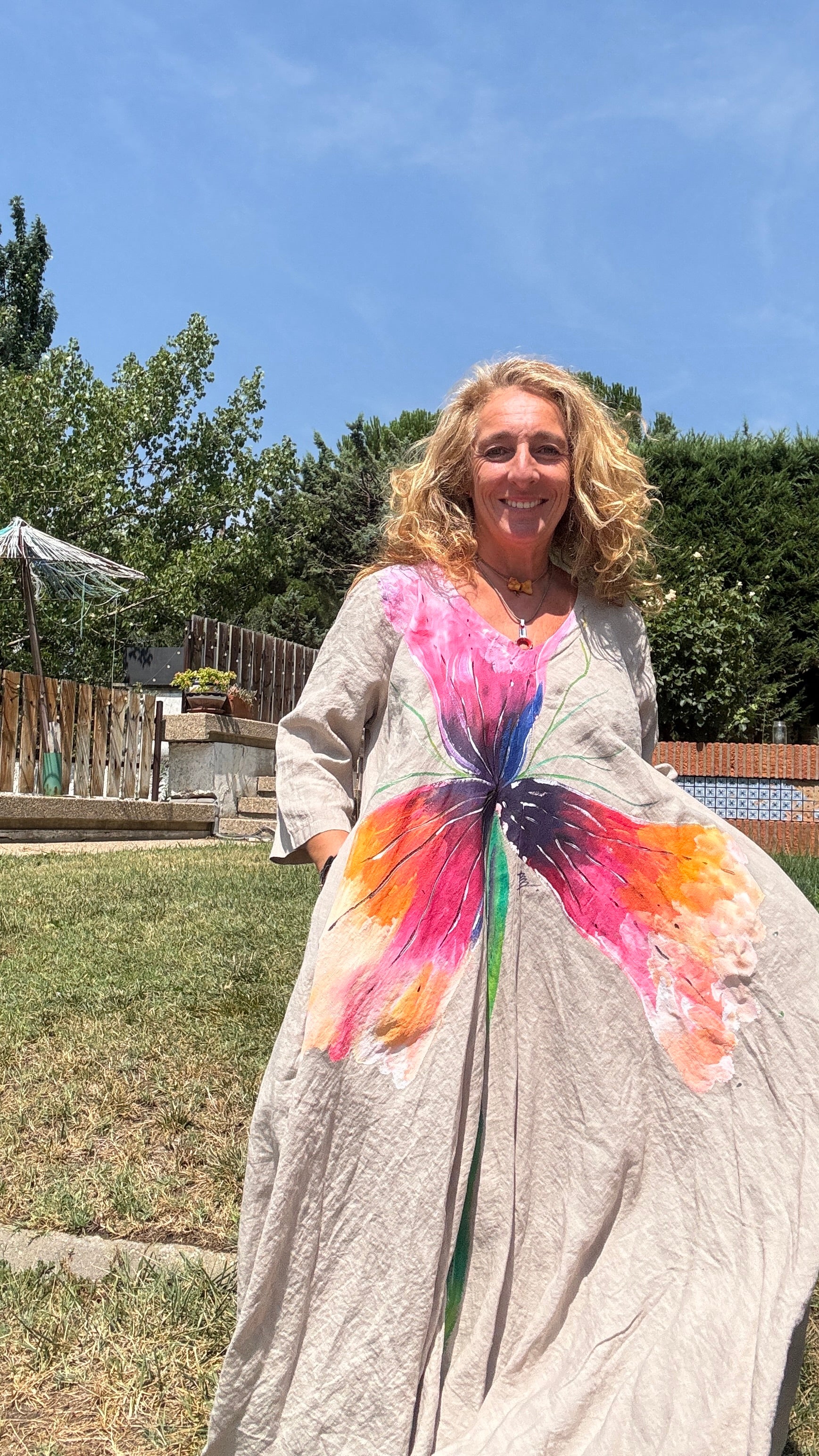 Vestido lino, color topo, bolsillos, talla única, medida de sisa a sisa 68 cm